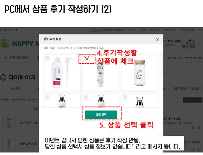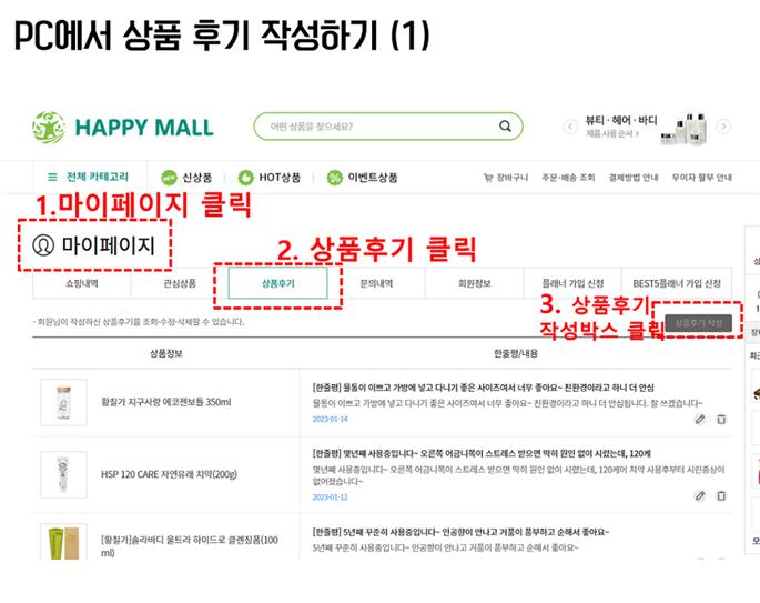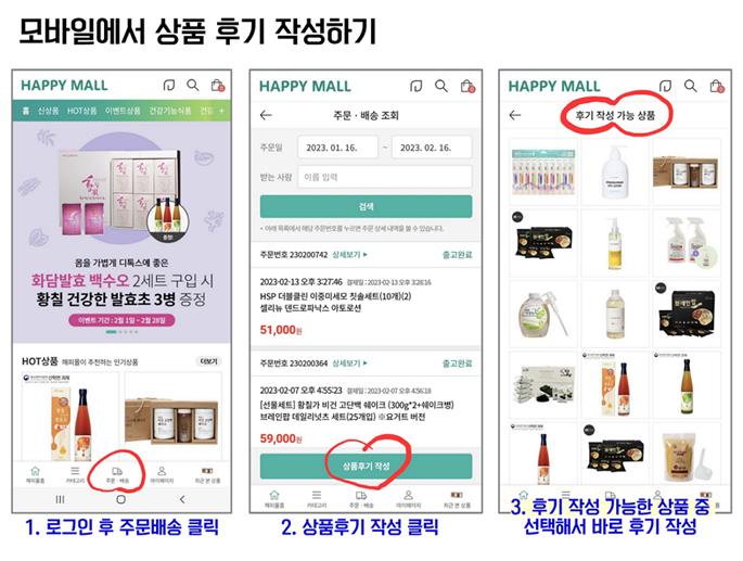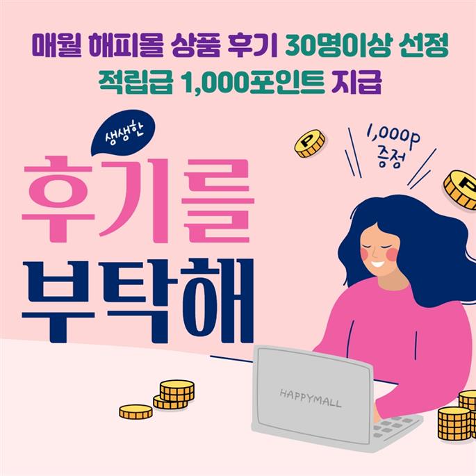 해피몰 사이트(어플/모바일)에서 구매하신 상품의 후기(리뷰)를 작성해주시면 50명이상을 선정하여 1,000포인트 적립금을 지급해드립니다.