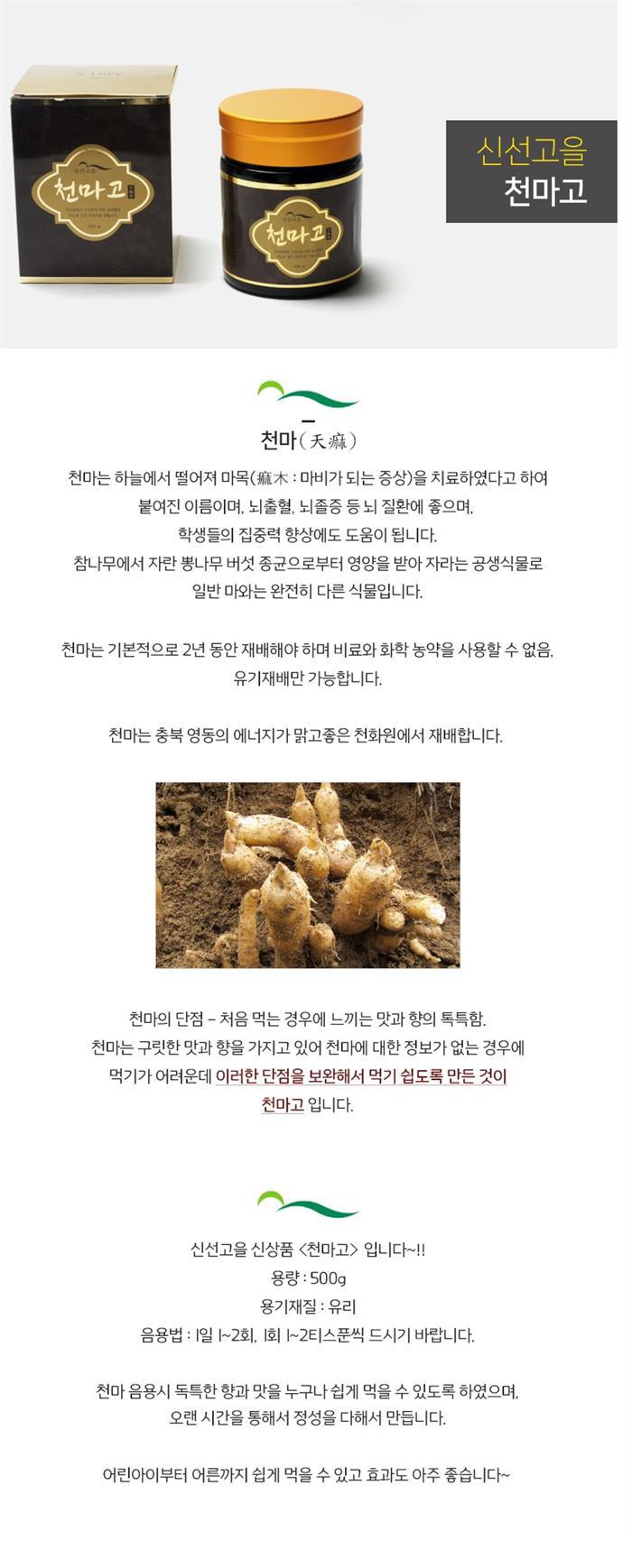 원재료명/함량 천마분말(국산) 13%, 천마복합추출액(천마, 대추, 생강, 천궁, 당귀 이상 국산, 4brix 이상) 47%, 꿀(국산) 40%