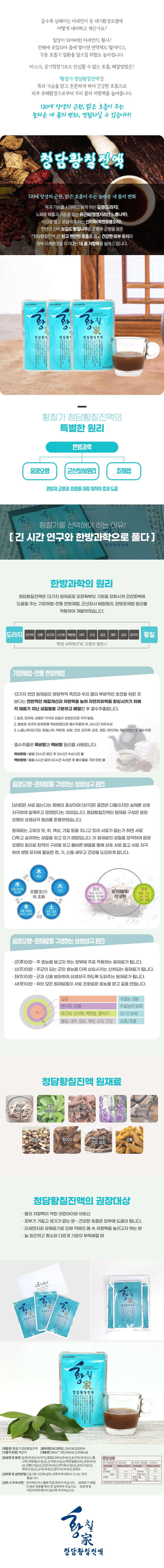 원재료명/함량 길경(국내산/도라지),황칠3.84%(국내산),유근피(국내산/느릅나무),맥문동(수입산),신이화(수입산/목련꽃봉오리),대추(국내산),강황(수입산),건강(국내산),연자육(수입산),감초(수입산),계피(수입산),교의(국내산),창이자(국내산),정제수